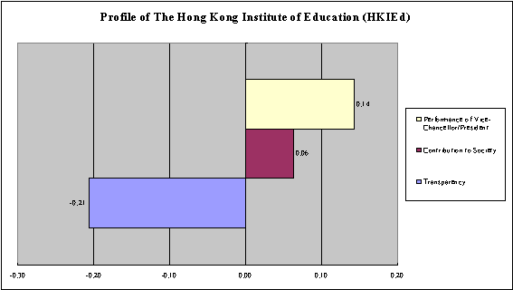 As a general observation, among the three attributes measured, transparency is a negative asset for all universities. HKU is unique in that the contribution made by its staff stands out as its only strength among the three attributes. For Lingnan and CityU, the performance of their Presidents stands out to be their only strength among the three attributes. For all universities, there seems to be a mixture of strengths, with CUHK more on the contribution attribute, and others more on the performance of their Vice-Chancellors/Presidents. | |||||||||||||||||||||||||||||||||||||||||||||||||||||||||||||||||||||||||||||