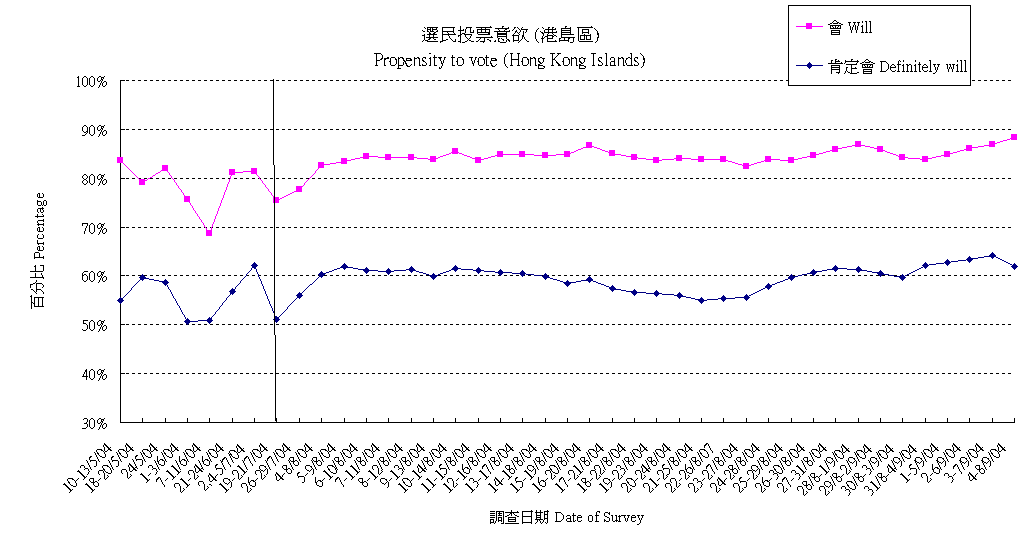| 未決定/唔知/難講 | 32.2% | 33.6% | 33.7% | 34.4% | 38.3% | 40.7% | 40.4% | 41.1% | 40.8% | 40.5% | 39.7% | 38.9% | 38.7% | 36.8% | 36.7% | 37.2% | 37.5% | 38.1% | 39.9% | 43.3% | 43.8% | 46.2% | 47.8% | 48.2% | 46.3% | 45.1% | 43.9% | 43.7% | 46.6% | 45.3% | 45.8% | 46.1% |